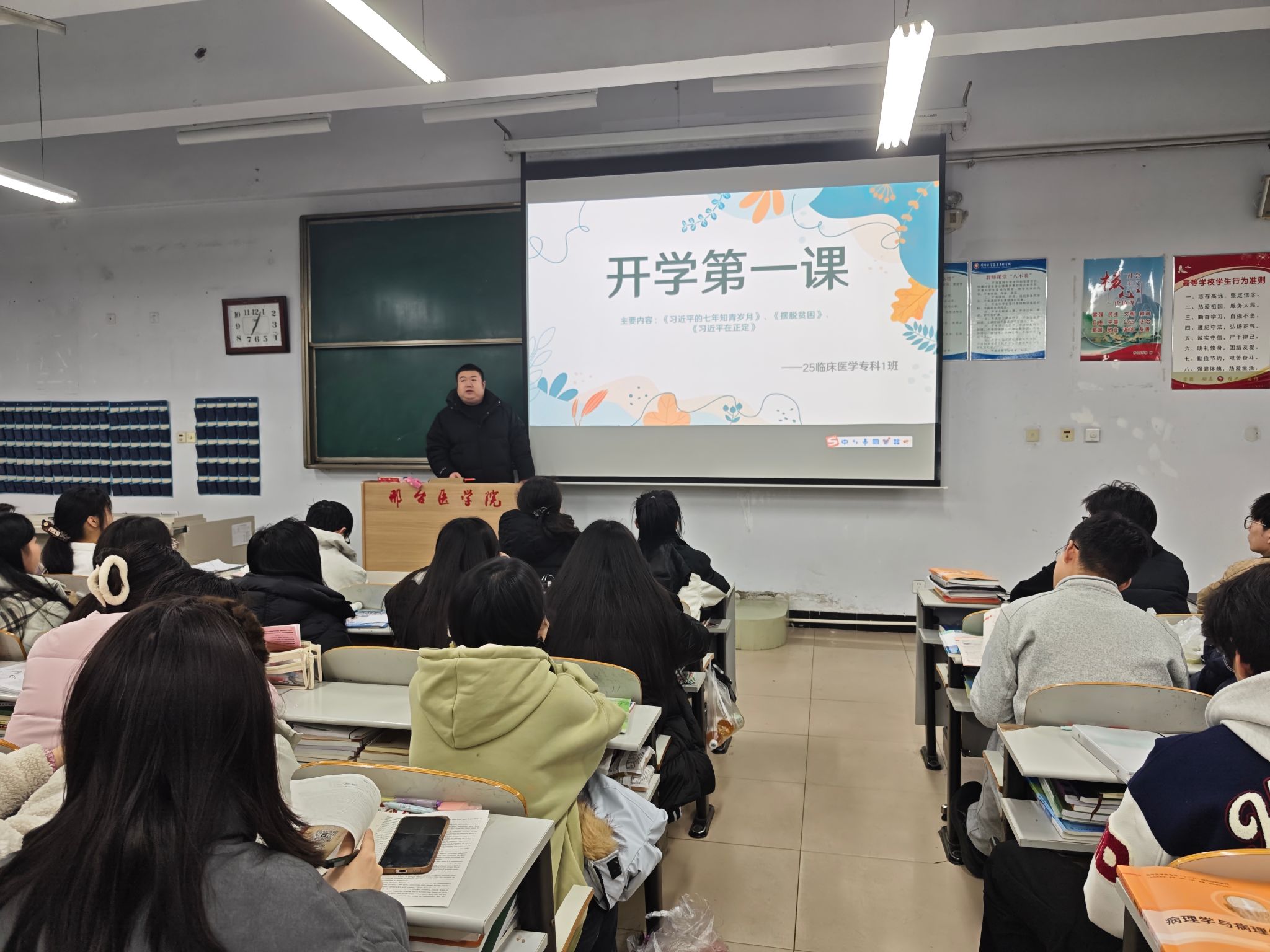 为落实学校春季学期“开学第一课”工作要求,强化青年学生思想引领,筑牢理想信念之基,临床医学系组织各班级召开“开学第一课”主题班会,带领全体学生深读细读《习近平的七年知青岁月》、《摆脱贫困》、《习近平在正定》等部分内容,切实把思政教育融入新学期开局工作,现将总结如下: